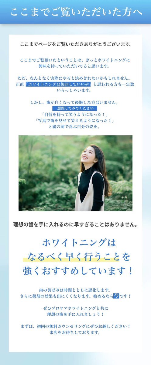 ホワイトニングは、歯を磨くことでは白くすることができない段階まで白くすることができるので、黄ばみに悩んでいる方にはおすすめです。