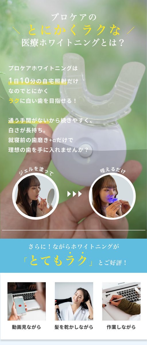 歯科医で行うホワイトニングに比べると低価格で済み、その割に効果が感じられて、痛みがないことも評価されています。